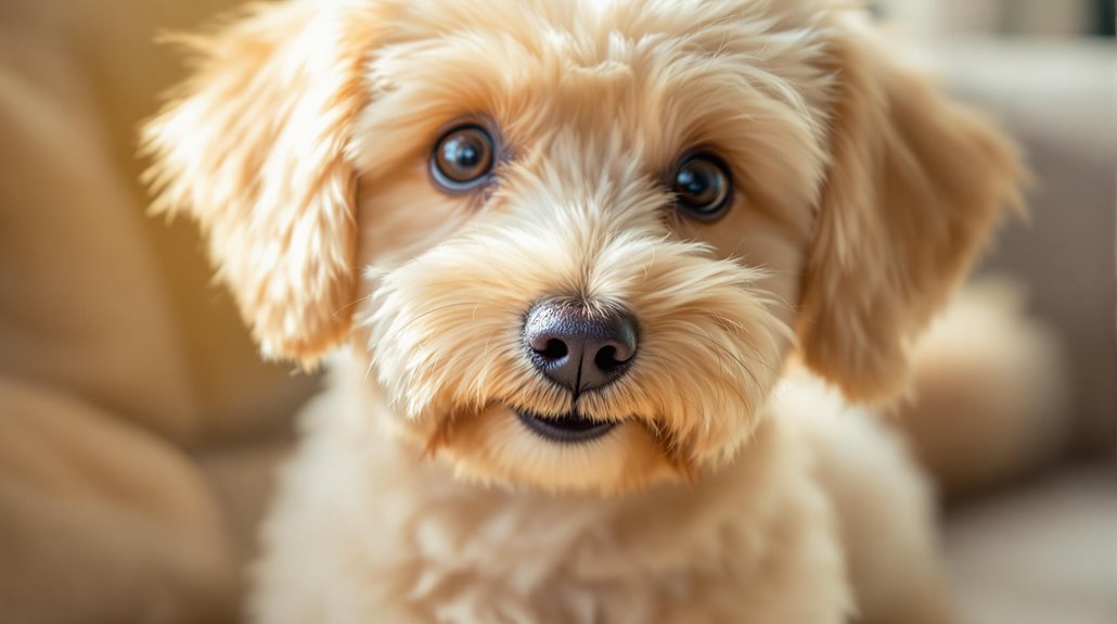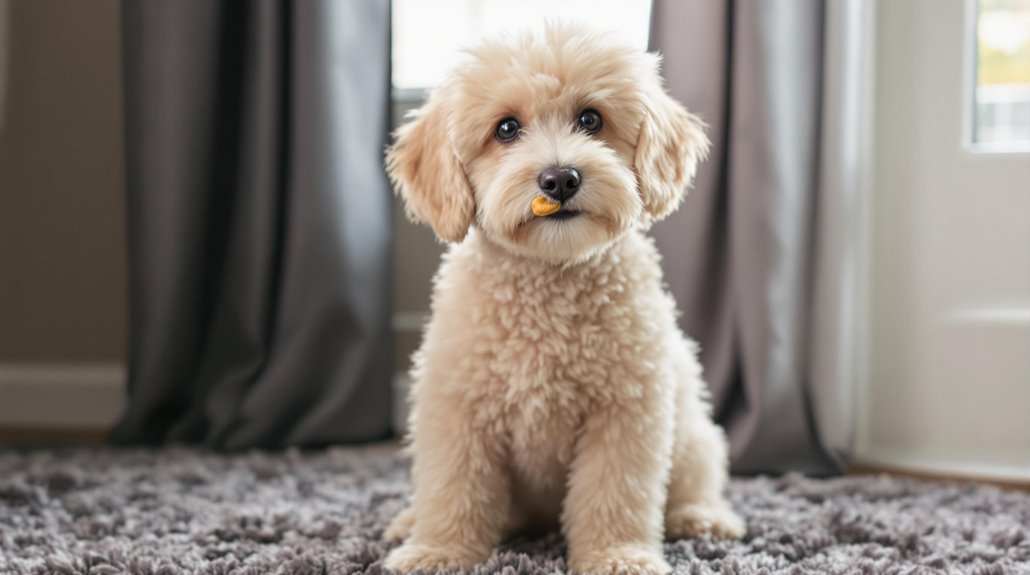When setting up your home for a Maltipoo, you'll want to create a peaceful environment away from loud noises and excessive activity. They thrive in calm settings where they can feel secure. Their hypoallergenic coat is particularly beneficial for apartment living, as you won't need to worry about excessive fur accumulating in your confined space or triggering allergies in close quarters.