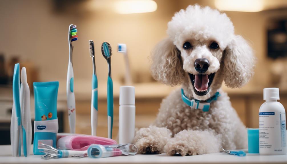 To maintain optimal oral health for your Poodle, daily brushing with dog-specific toothpaste and toothbrushes is essential. Poodles are prone to dental issues, making preventive care crucial. Brushing helps prevent plaque and tartar buildup, which can lead to gum disease and tooth decay. Start introducing dental care routines early to acclimate your Poodle to teeth brushing. Using specialized toothpaste and brushes designed for dogs is important as human toothpaste can be harmful if ingested. Additionally, regular veterinary check-ups are vital to monitor your Poodle's dental health and catch any issues early. Professional cleanings by a veterinarian are also recommended to ensure a thorough removal of plaque and tartar that brushing alone may not address. By incorporating these dental hygiene tips into your Poodle's routine, you can help maintain their oral health and overall well-being.