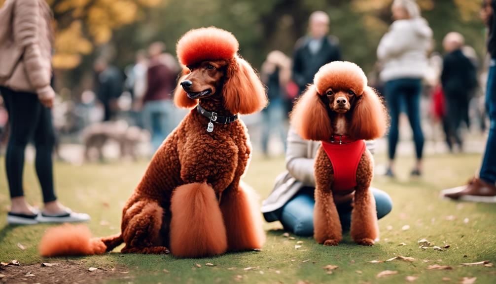 Regular grooming sessions are essential for Red Poodles to maintain their luxurious coat and overall health. Professional grooming every 4 to 6 weeks is recommended to keep their red coat healthy and mat-free. Trimming techniques play a crucial role in shaping the coat to enhance the appearance of Red Poodles. Various styling options like the puppy cut, teddy bear cut, or continental clip can be chosen to suit individual preferences. These grooming techniques not only showcase the beauty of their red coat but also contribute to their overall well-being. By staying consistent with grooming practices, you can help your Red Poodle look and feel their best, ensuring they remain happy and healthy.